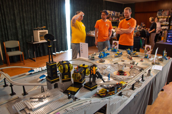 Mein persönliches Highlight an dem Wochenende waren ganz klar die Leute. Die engagierten Mitglieder des Vereins Der helfende Stein haben mit unglaublicher Freude und Einsatzbereitschaft bereits lange vor der eigentlich Ausstellung in einem Discord (kannte ich nicht, sowas wie ein Forum nur in kompliziert) organisiert, geplant und sich abgestimmt. Und am Freitag vor der Ausstellung ging es dann richtig los: Aufbau bis spät in die Nacht, jedes Kabel verlegt, jede Baseplate ausgerichtet, jeder Tisch dekoriert.